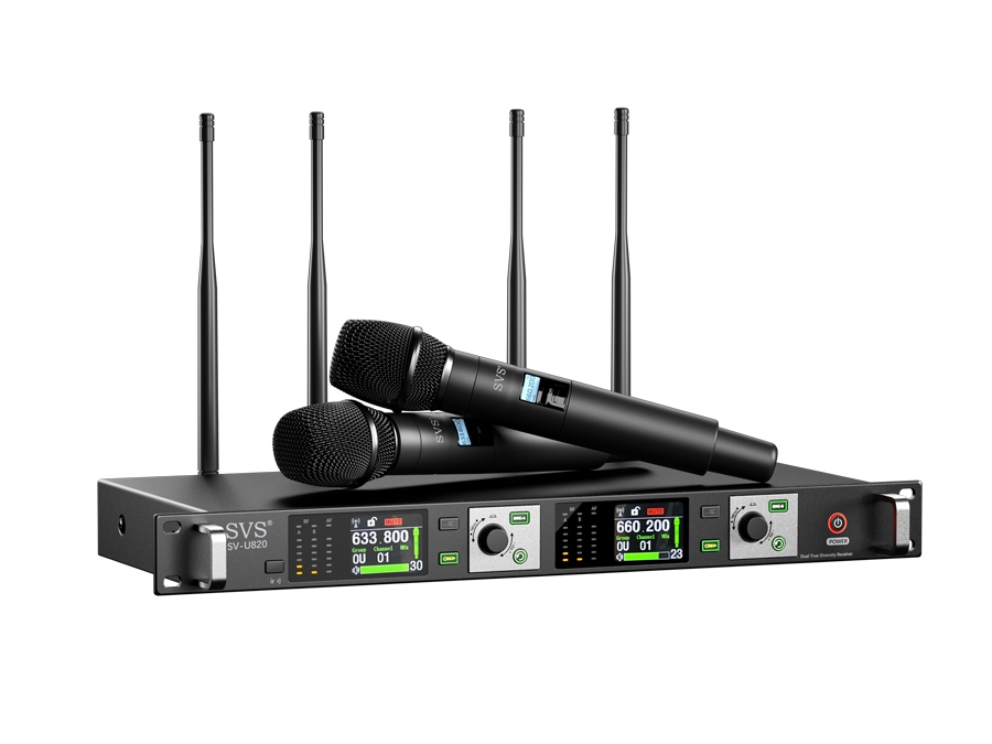 真分集一拖二設計無線話筒,采用UHF頻段;4根外置全向高增益天線自動切換信號通道,確保信號穩定;接收機支持手動和自動兩種頻率選擇方式,并支持數字導頻技術,一鍵自動搜頻;支持麥克風電量監視功能等。