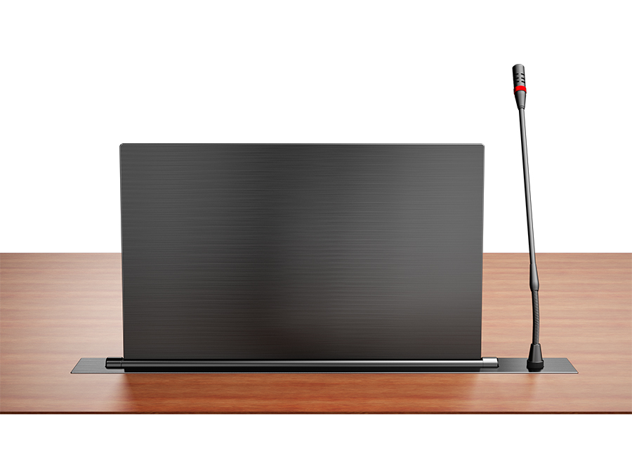 該產品為超薄液晶屏升降器(帶會議發言功能),采用結構與顯示屏一體式設計,整機大部分采用鋁合金材料,結合一次性模具成型的金屬外殼,美觀精致。產品動力采用直角疊加式齒輪與齒條嚙合傳遞和同步輪同步帶傳動,結合直線軸承導向,完成精準運動。產品標配內嵌式15.6英寸全高清液晶顯示屏, 選配觸摸板,支持10點觸摸,即插即用。產品還搭配高級會議系統單元,支持單機或者會議系統組網使用。